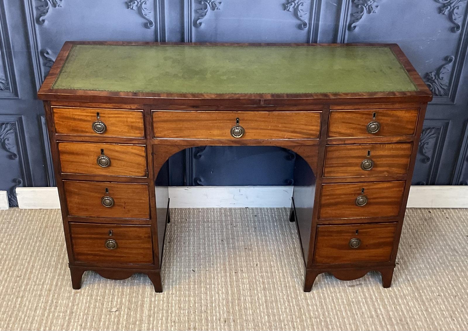 19th Century antique mahogany desk with inset gilt tooled leather writing surface, above a central drawer with four drawers to either side and supported on bracket feet