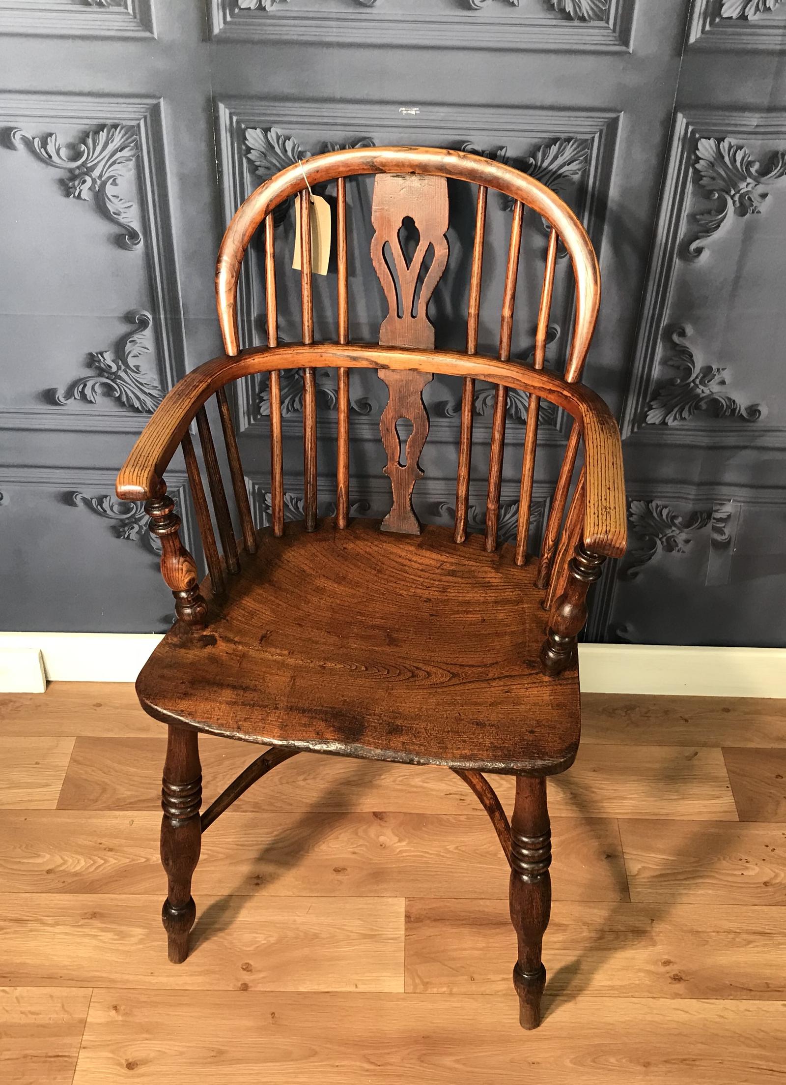 Good Ash & Elm low back Windsor chair with turned a supports, turned legs, attractive pierced splat and the more desirable Crinoline stretcher