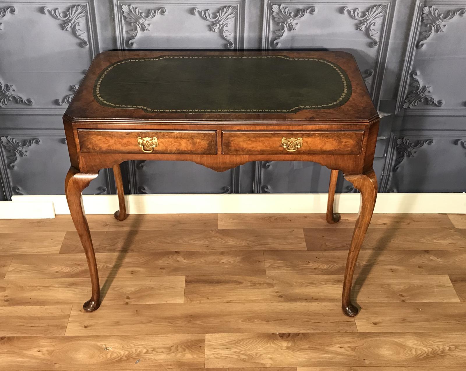 Super quality Burr Walnut two drawer writing table/desk sitting on slender cabriole legs fitted with a shaped insert of green tooled leather, polished to the back so can be used free standing, the drawers are fitted with the original pierced brass back plate and swan neck handles, the four corners are canted just been cleaned and waxed by ourselves this desk would enhance any setting