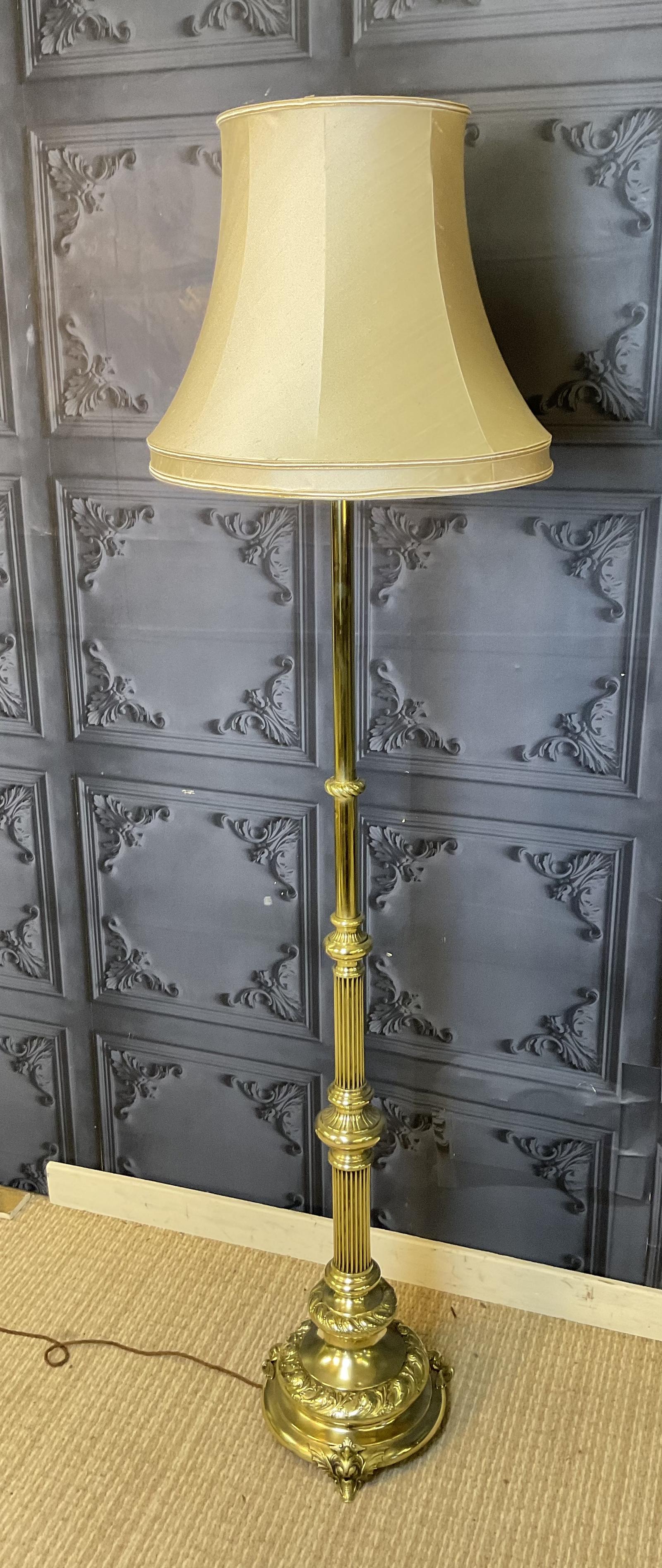 Good quality Edwardian antique brass standard lamp in working condition, the lamp will be re-wired before delivery, reeded column on decorative round base.