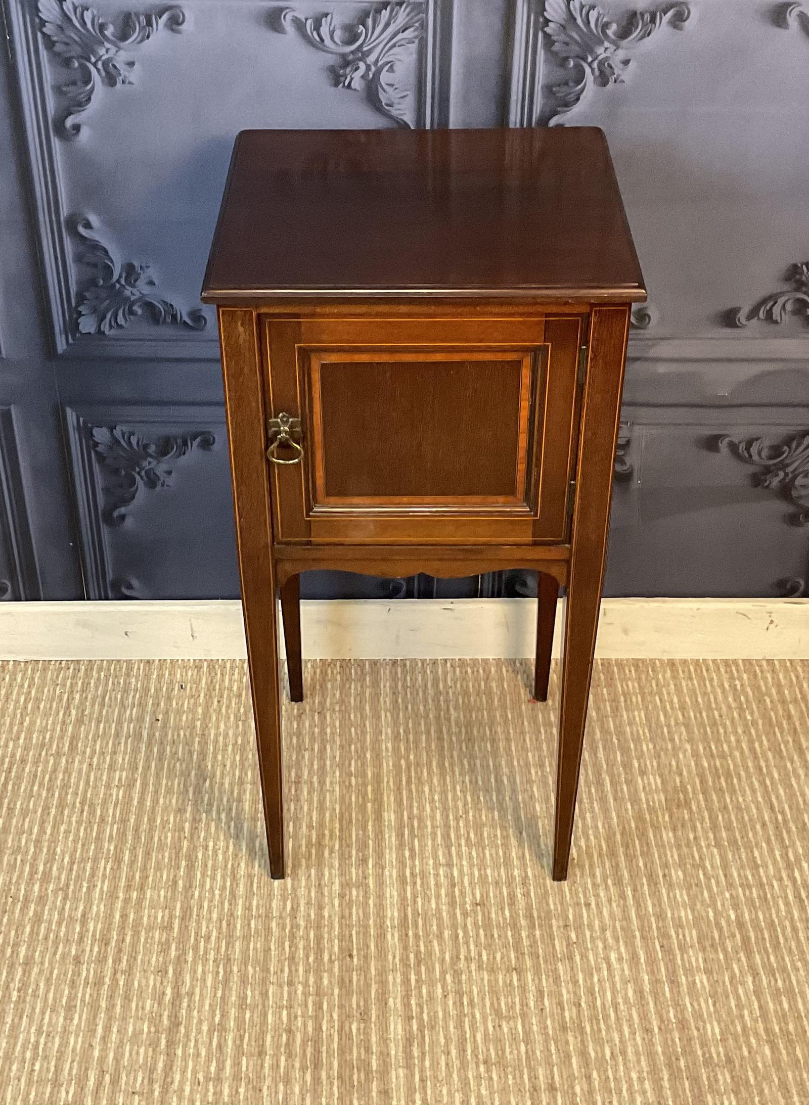 Good Edwardian Inlaid Mahogany Nightstand having single cupboard door and standing on square tapering legs