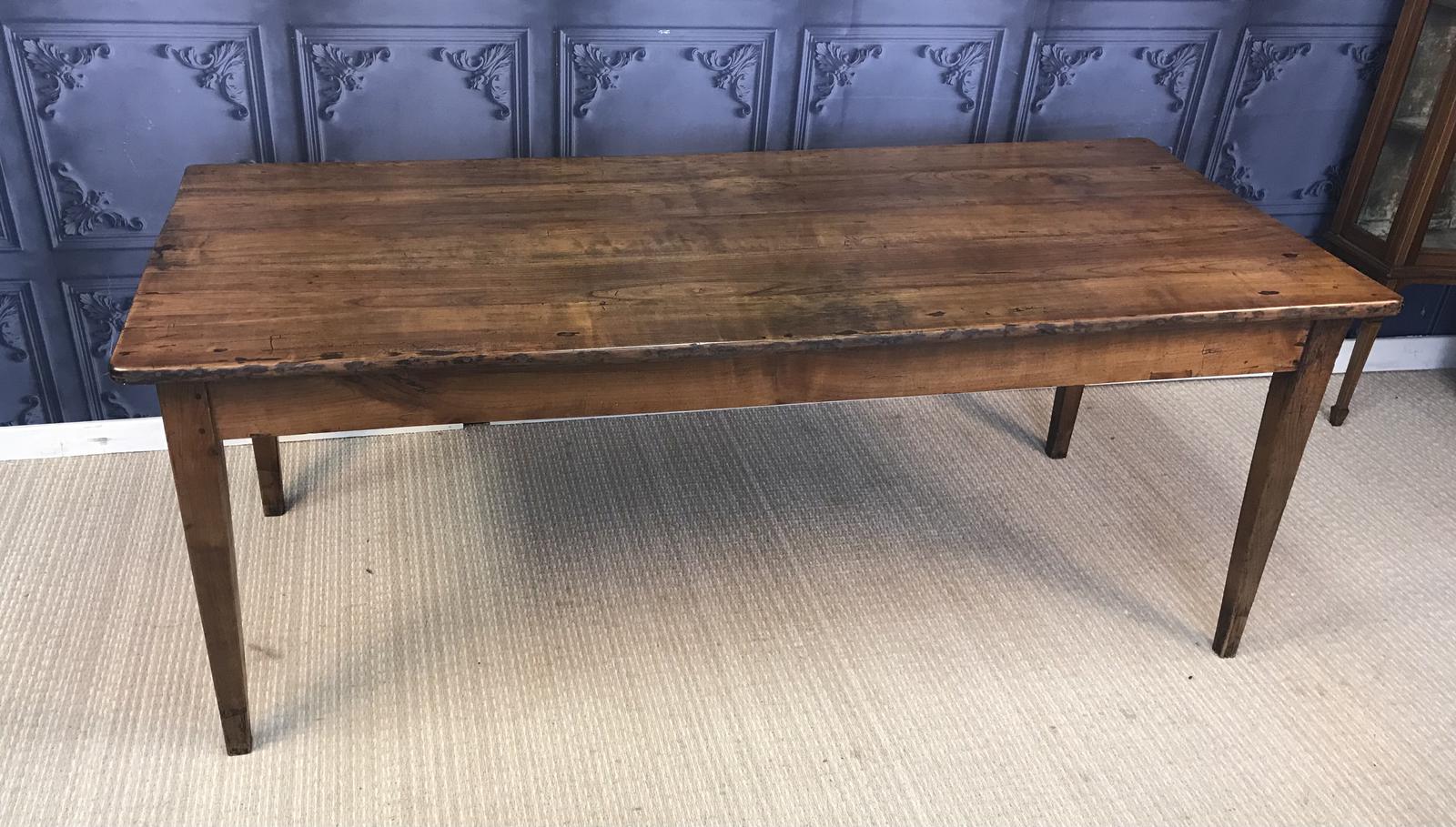 Good French Farmhouse table in Chestnut with single drawer and pull out tray, good substantial table with some old signs of worm and legs have been tipped