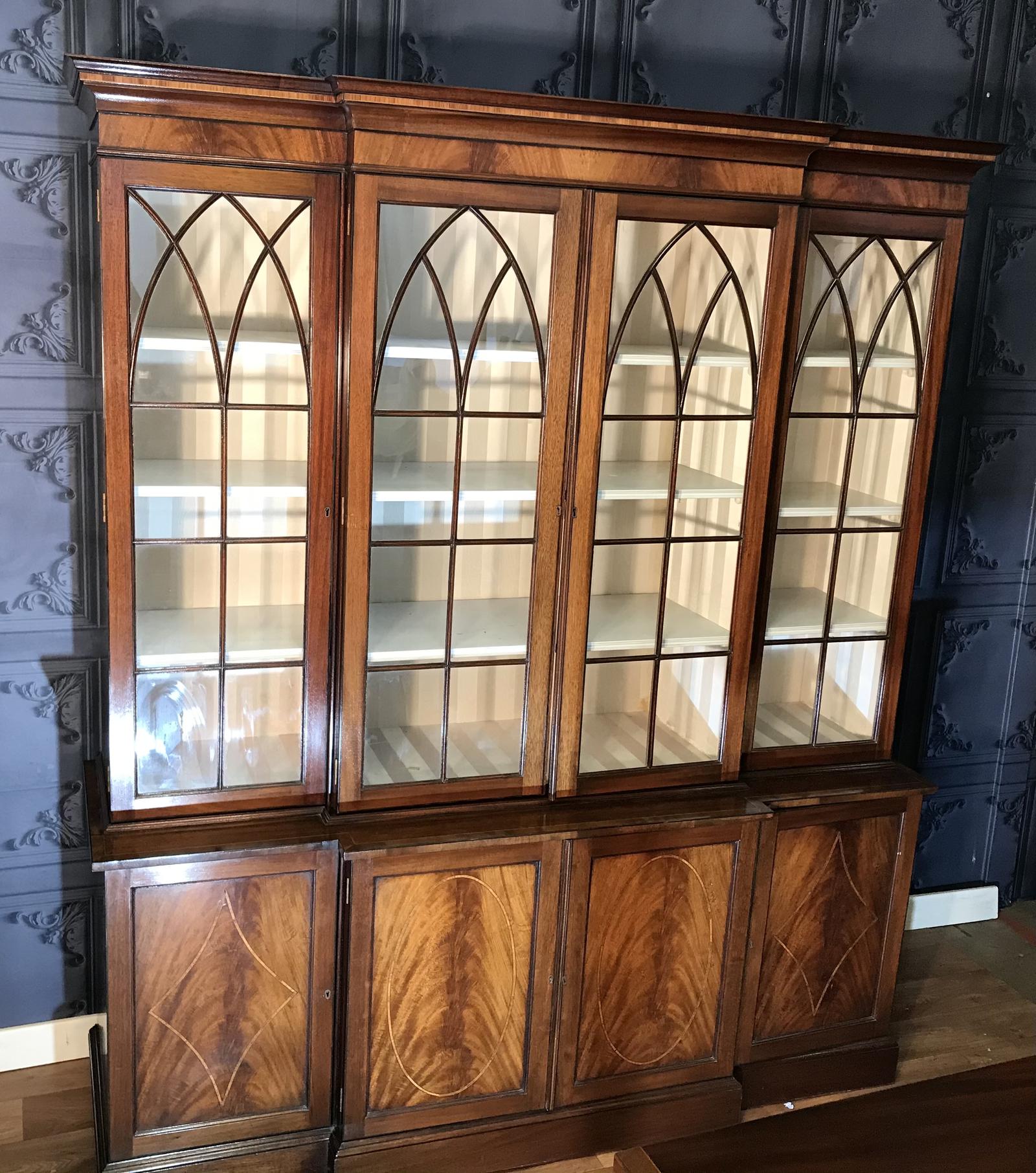 Good quality Georgian Style Mahogany Breakfront Library Bookcase with stepped cornice above four glazed doors with arch decorative moulding, the base having string inlay to the door fronts, cleaned and waxed by ourselves using traditional methods