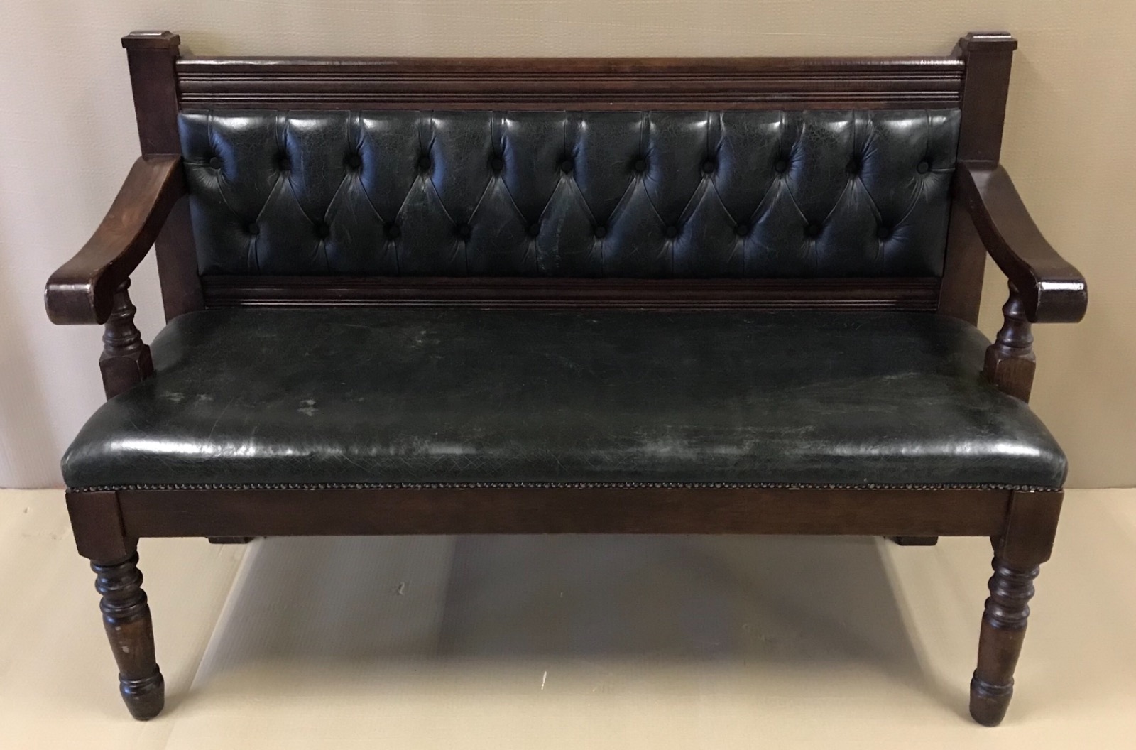 Victorian style hall settle with buttoned back leather panel and leather upholstered seat, sitting on two turned front legs the settle dates from around 1960