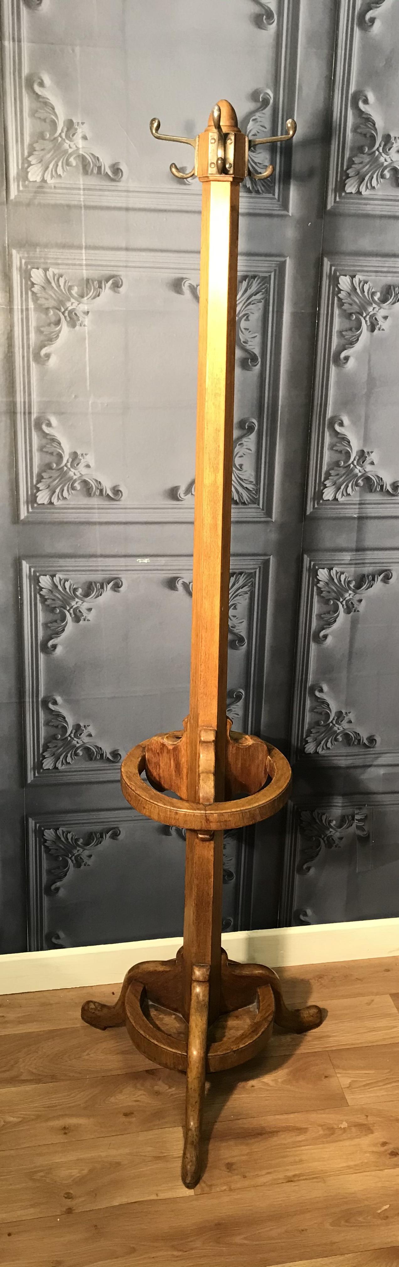 Good quality mahogany coat hat stand shaped central column topped with a finial three section stick umbrella receiver sitting on a tripod base with pad feet