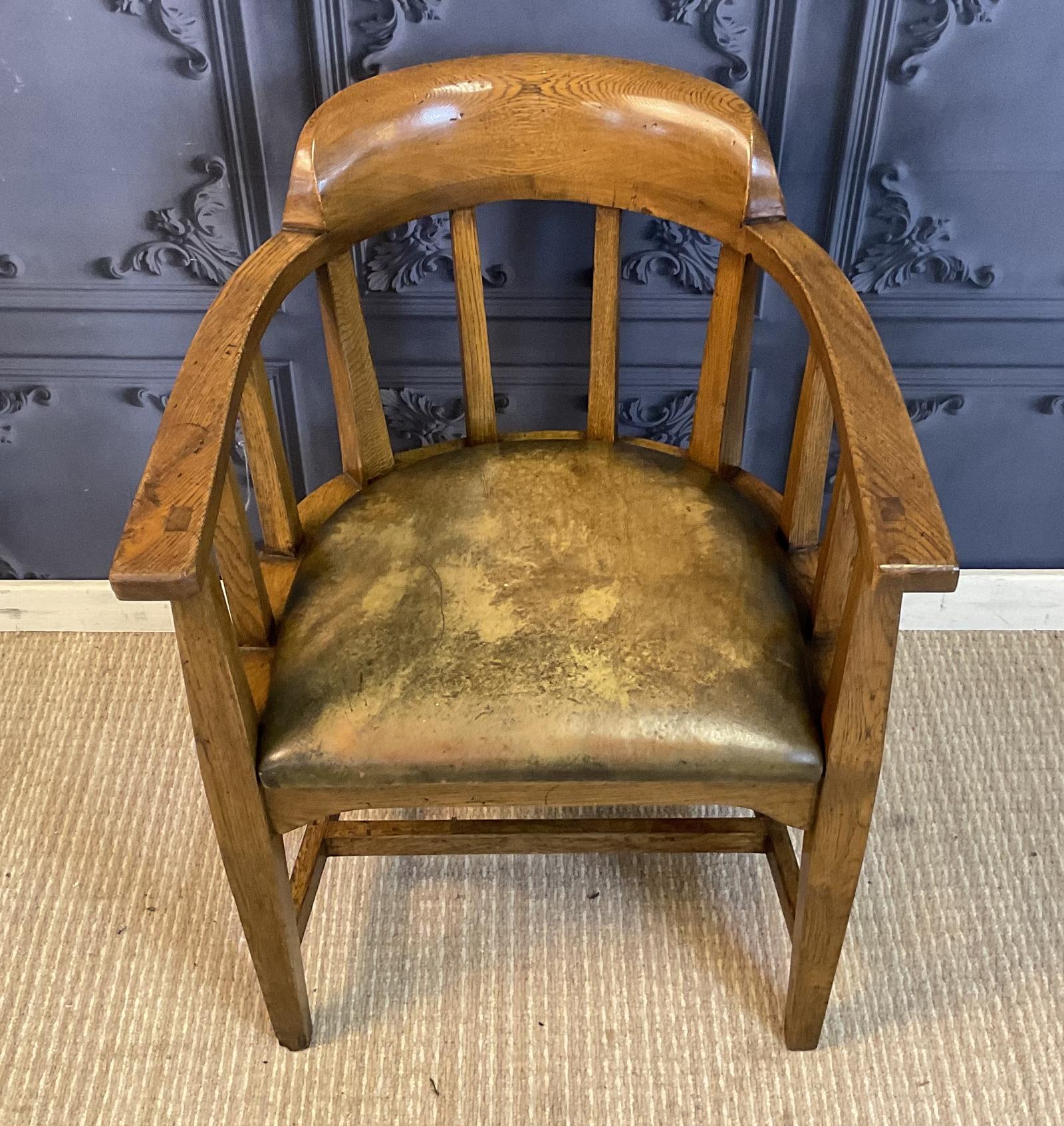 Good quality Arts & Crafts style oak desk chair with graduated rails to the back, shaped leg to the rear and straight legs to the front joined by a double stretcher for additional strength.