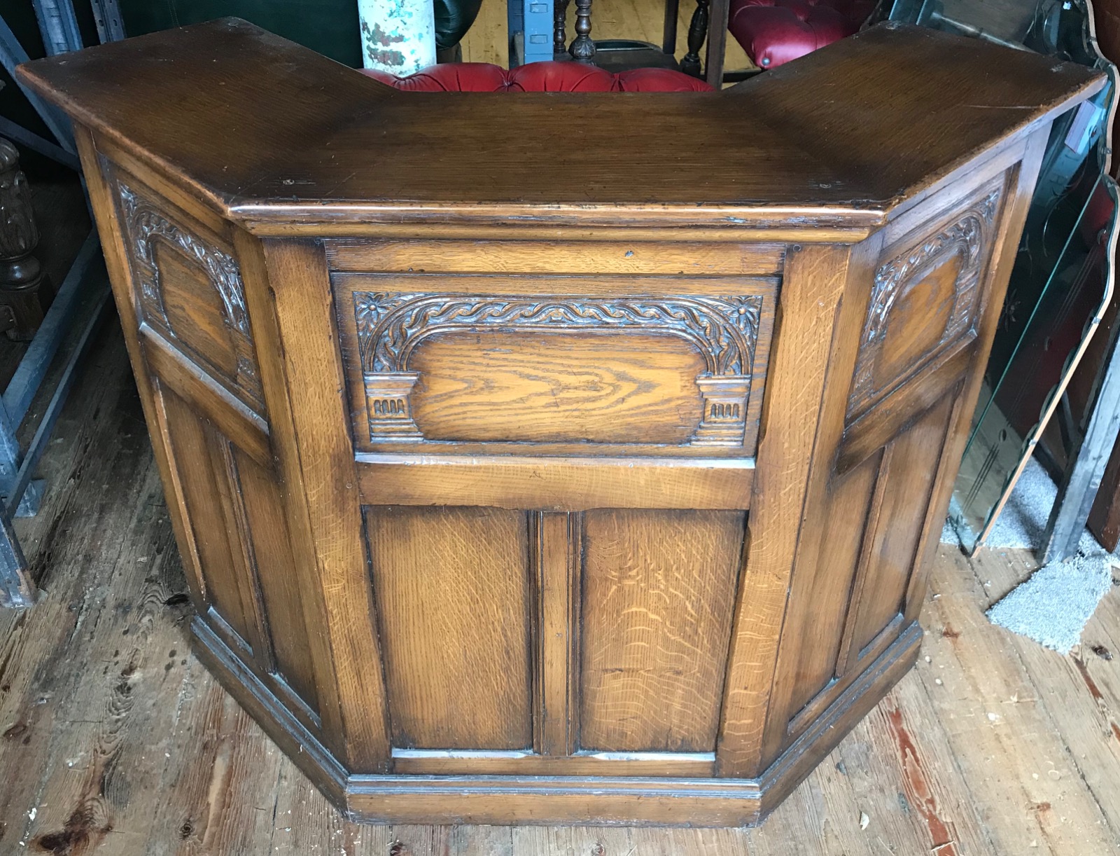 Oak home bar with decorative panels over panelled bottom section fitted to the rear with shelves and a cupboard