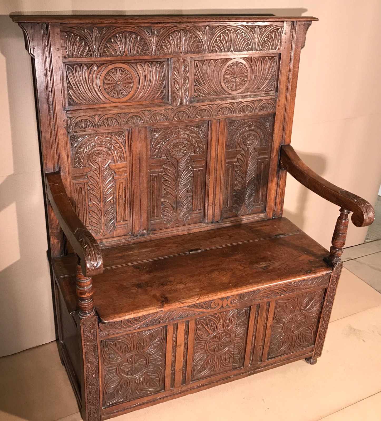 Good carved oak hall bench dating from the Victorian era, profusely carved panelled back, scrolled arms over a three panel seat area, the seat area has a lift up seat for useful additional storage.