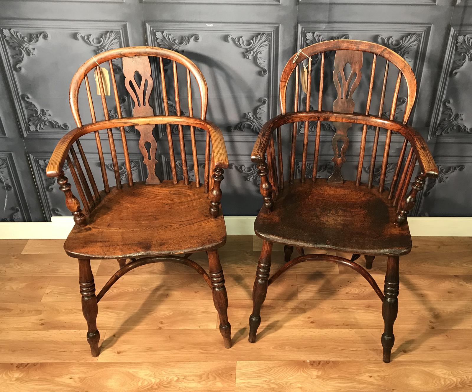 Good Pair of Ash and Elm Low Back Windsor Chairs with turned arm supports and legs, attractive pierced splat and the more desirable Crinoline stretcher, the chairs have been cleaned and hand waxed by ourselves using traditional methods