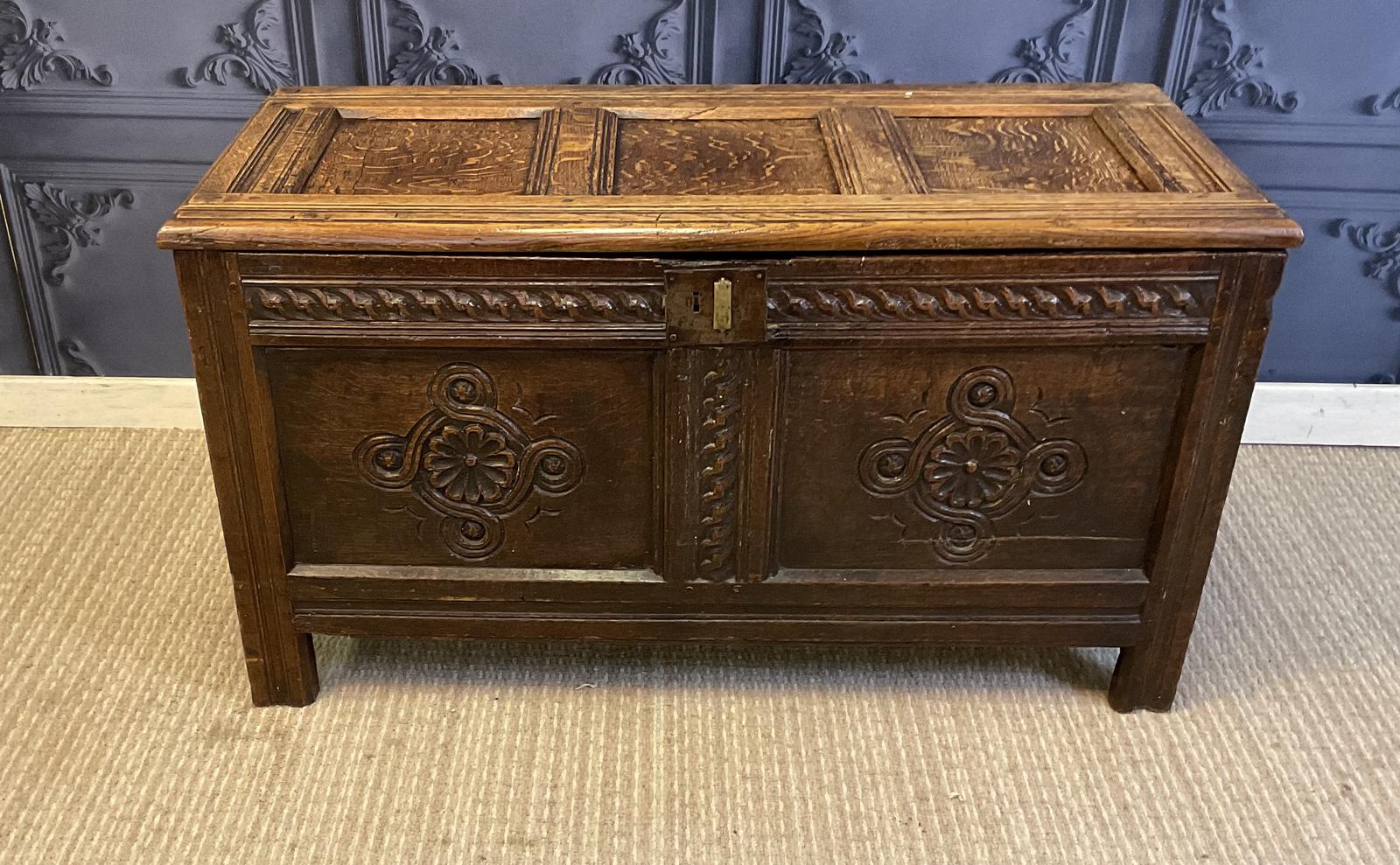 18th Century antique period oak coffer having three panel top and two carved panels to the front.