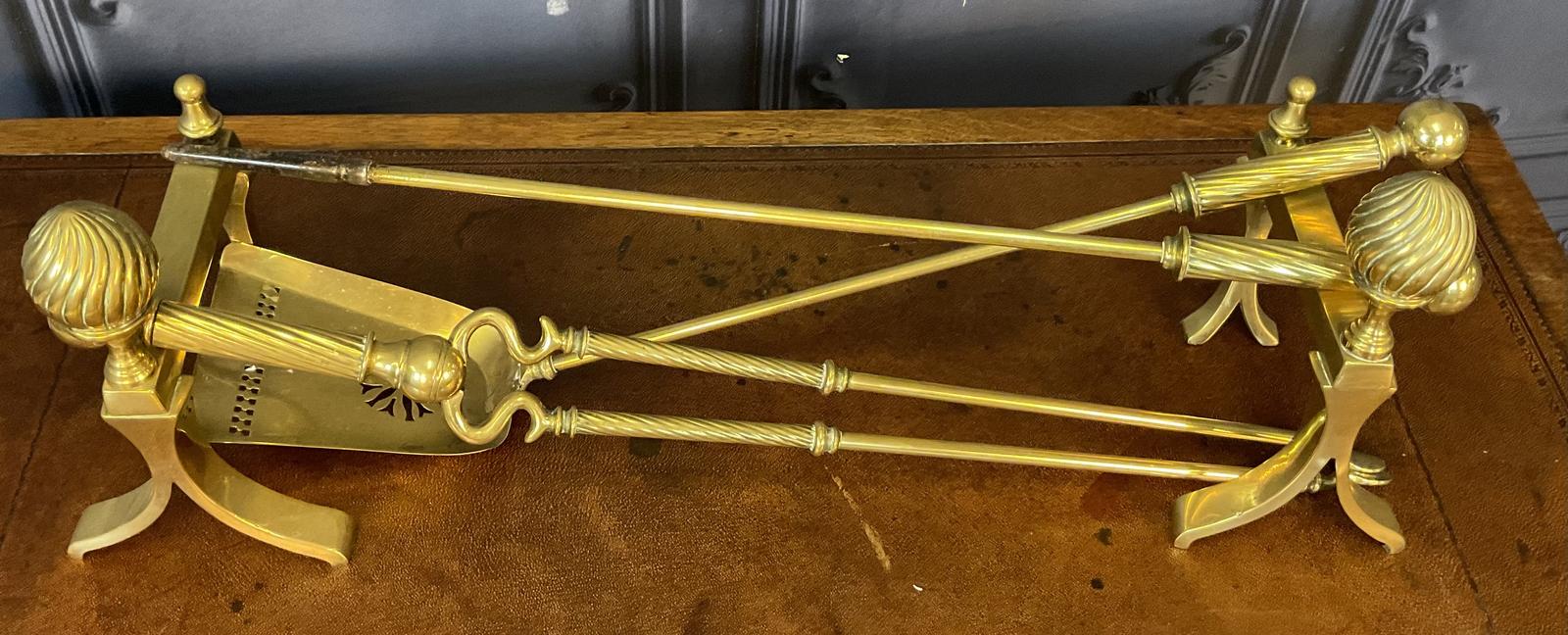 Quality Pair of Georgian Brass Andirons/Fire dogs and the matching Brass Fire tools, the and irons are cast brass with scrolled feet and large finial, the tools comprise of shovel, tongs and poker, these items can be polished if preferred, provenance from a Welsh Castle.