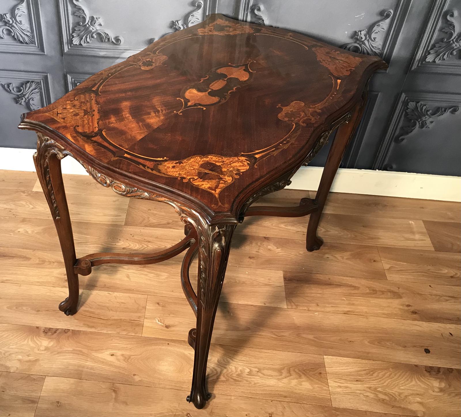 Superb quality Inlaid walnut occasional table, the top profusely inlaid and with each corner piece being different the base having a carved apron and supported on long slender cabriole legs with carving to the knee and terminating in a scrolled foot with a shaped X frame stretcher this table would grace any room