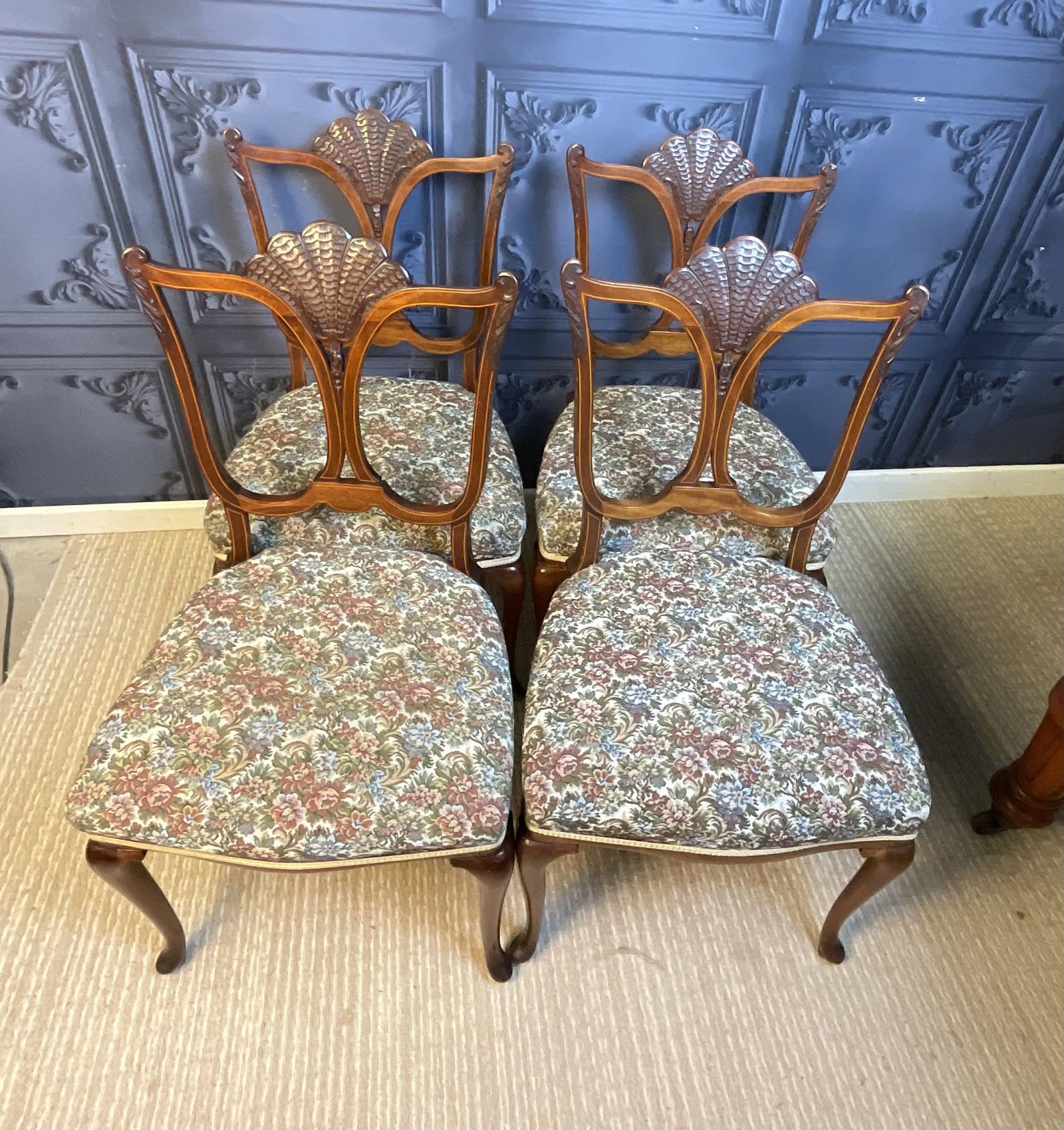 Good quality set of four inlaid mahogany chairs from the Edwardian era unusual fan back and standing on slender cabriole legs