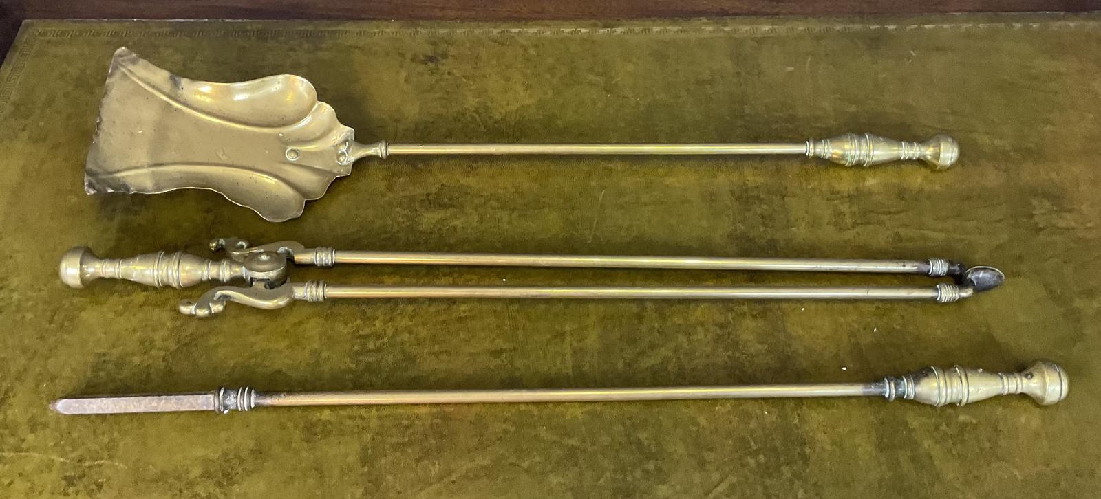 Good quality set of Georgian Brass Fire Tools, the set comprising of poker, shovel and tongs each with turned cast brass handle, provenance from a Welsh Castle.