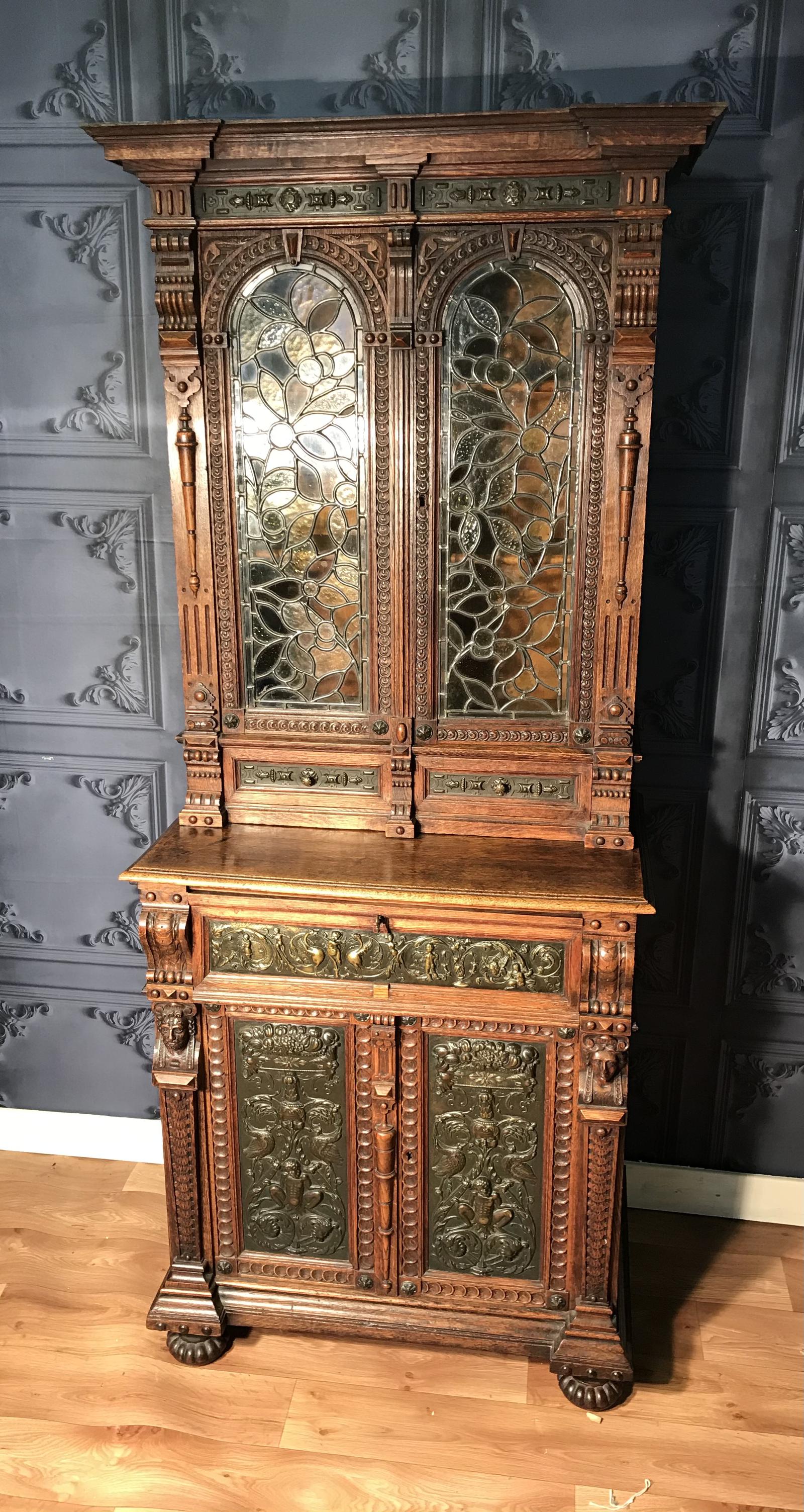 Superb Victorian Carved Oak Secretaire Bookcase with Stunning Coloured Leaded Glass doors, stepped cornice very unusual that the frieze below the cornice, drawer fronts and door panels are oxidised brass, the Secretaire drawer front having dancing nymph with swans, carved to the lower section with both a man’s and Lady’s head.