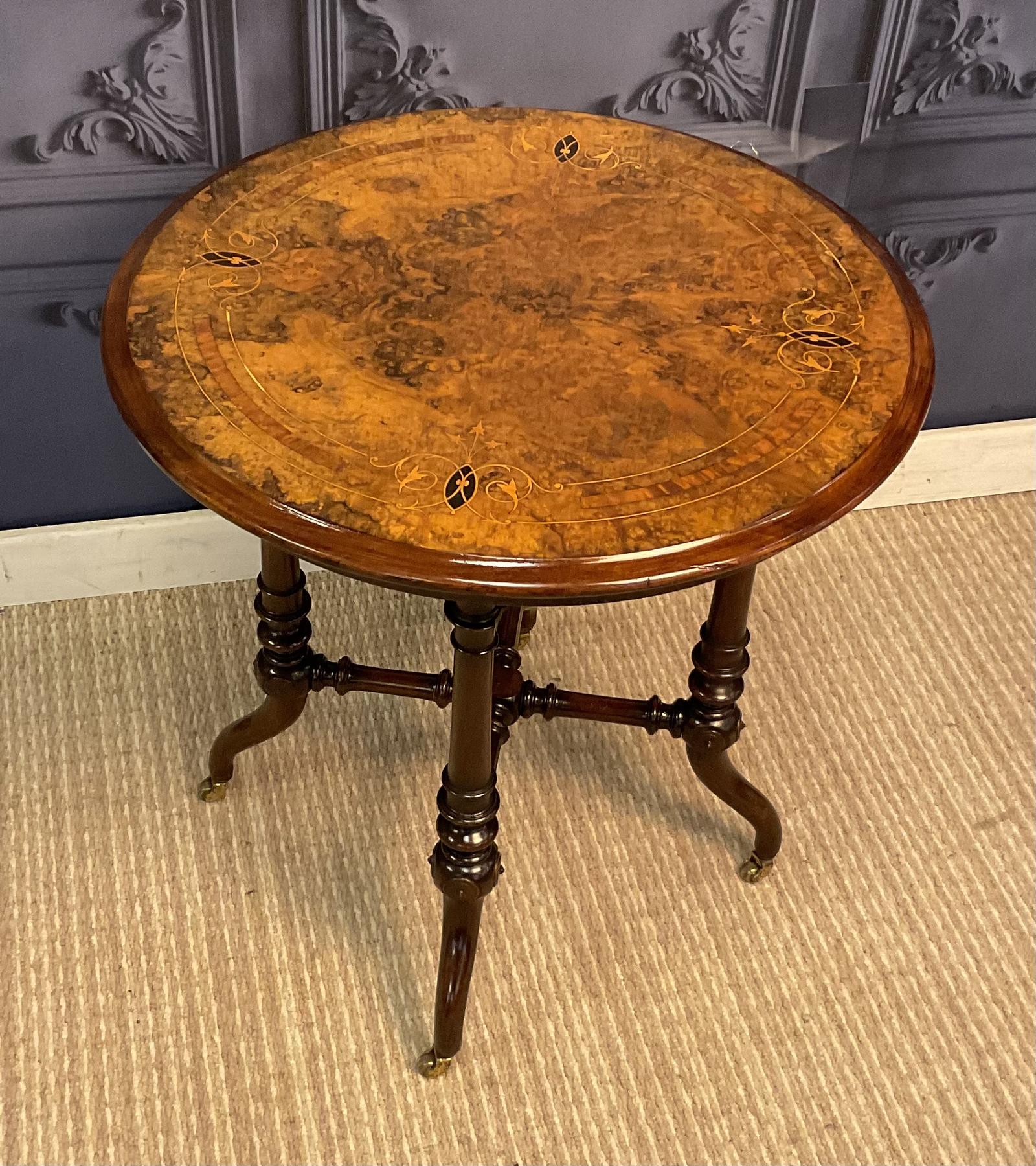 This is a stunning Victorian antique inlaid burr walnut occasional table supported on four turned legs joined by turned X-stretchers and terminating in a brass castor