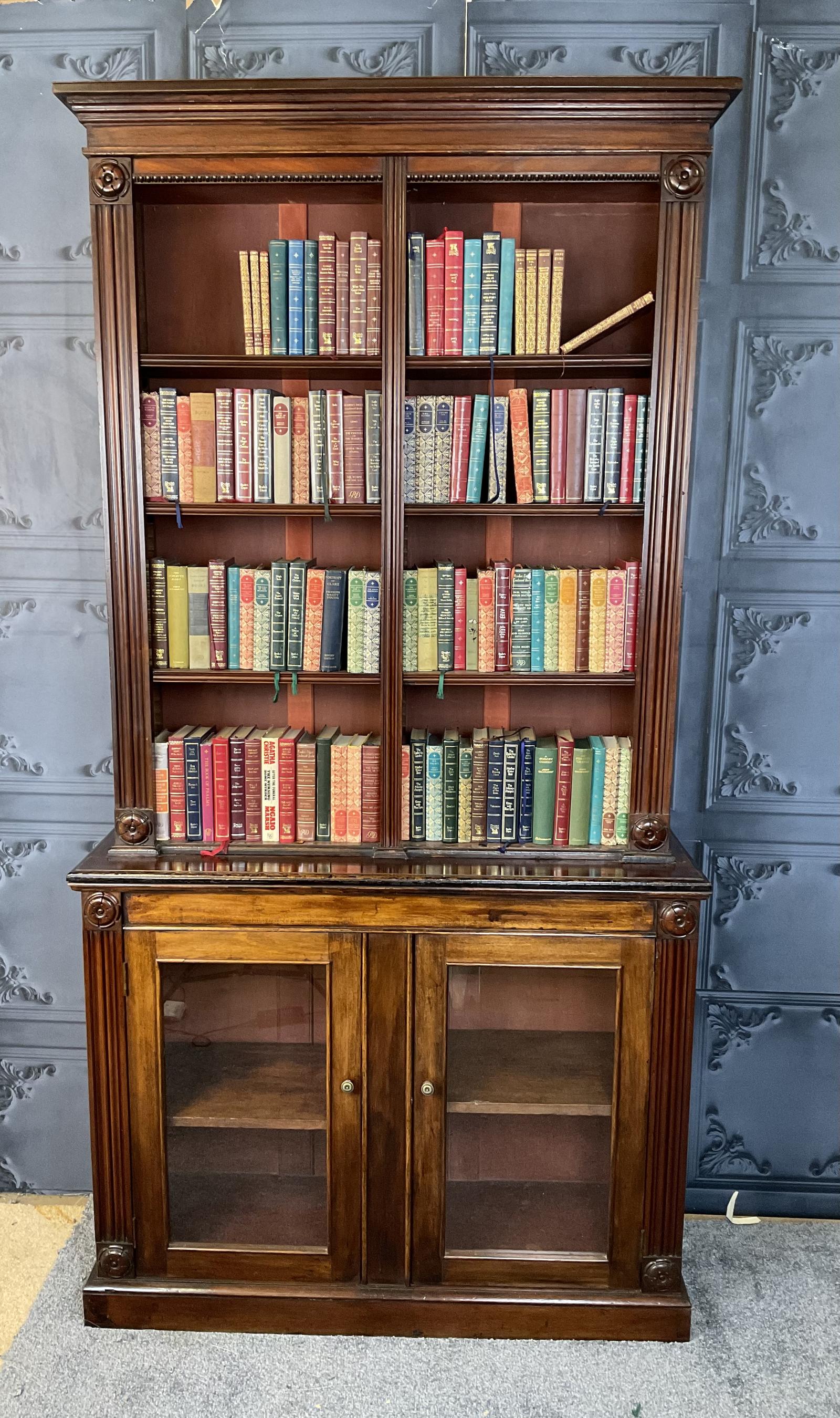 Early Victorian antique mahogany library bookcase with open shelves to the upper section and glazed doors to the bottom, top section of the bookcase is fitted with six adjustable shelves with a further shelf to the base section, having a stepped cornice and standing on a plinth base.