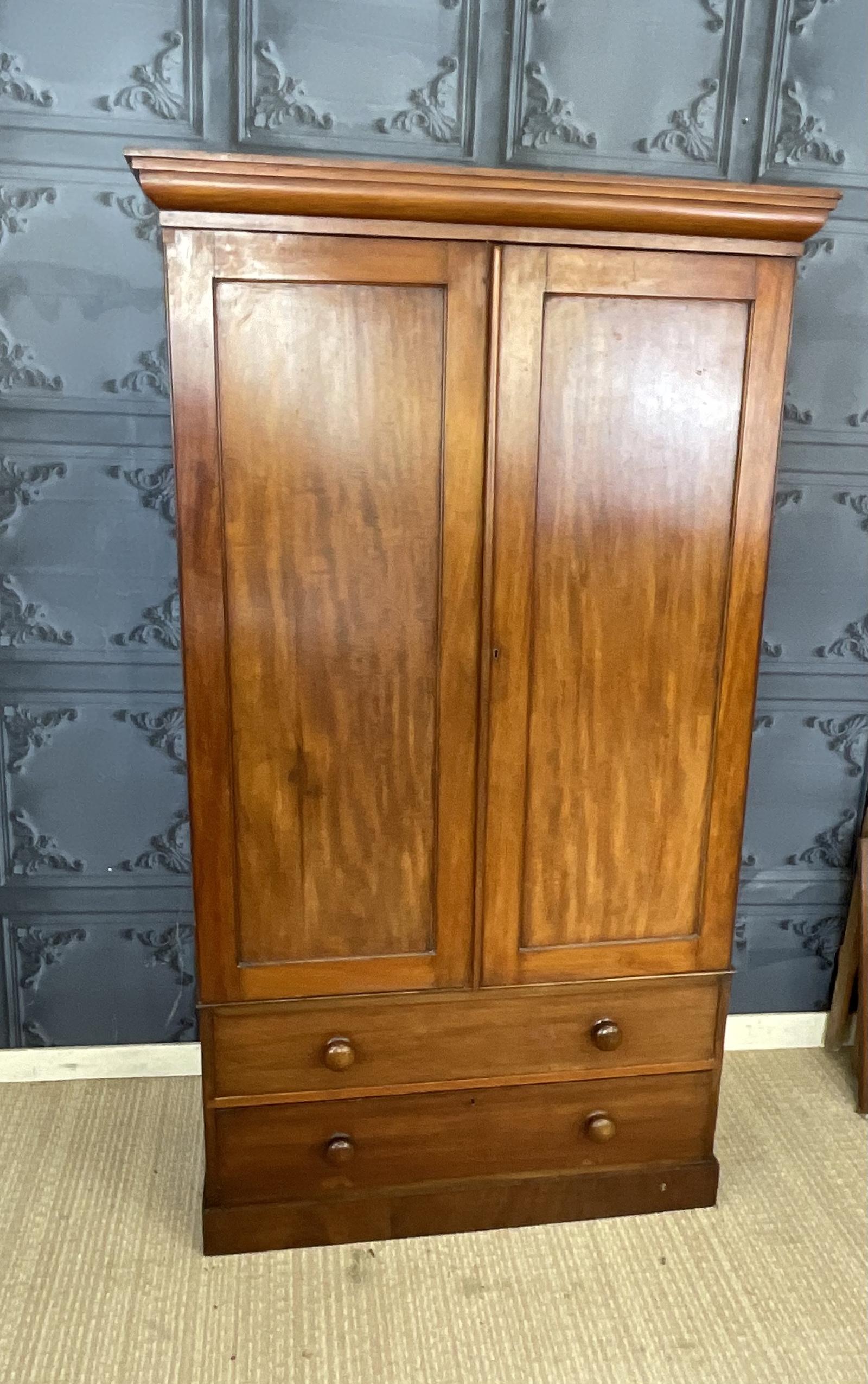 Victorian Mahogany Wardrobe, the moulded stepped cornice above two cupboards, opening to reveal a hanging rail and numerous hooks above a two drawer base with knob handles, the wardrobe comes in two pieces for easy transportation