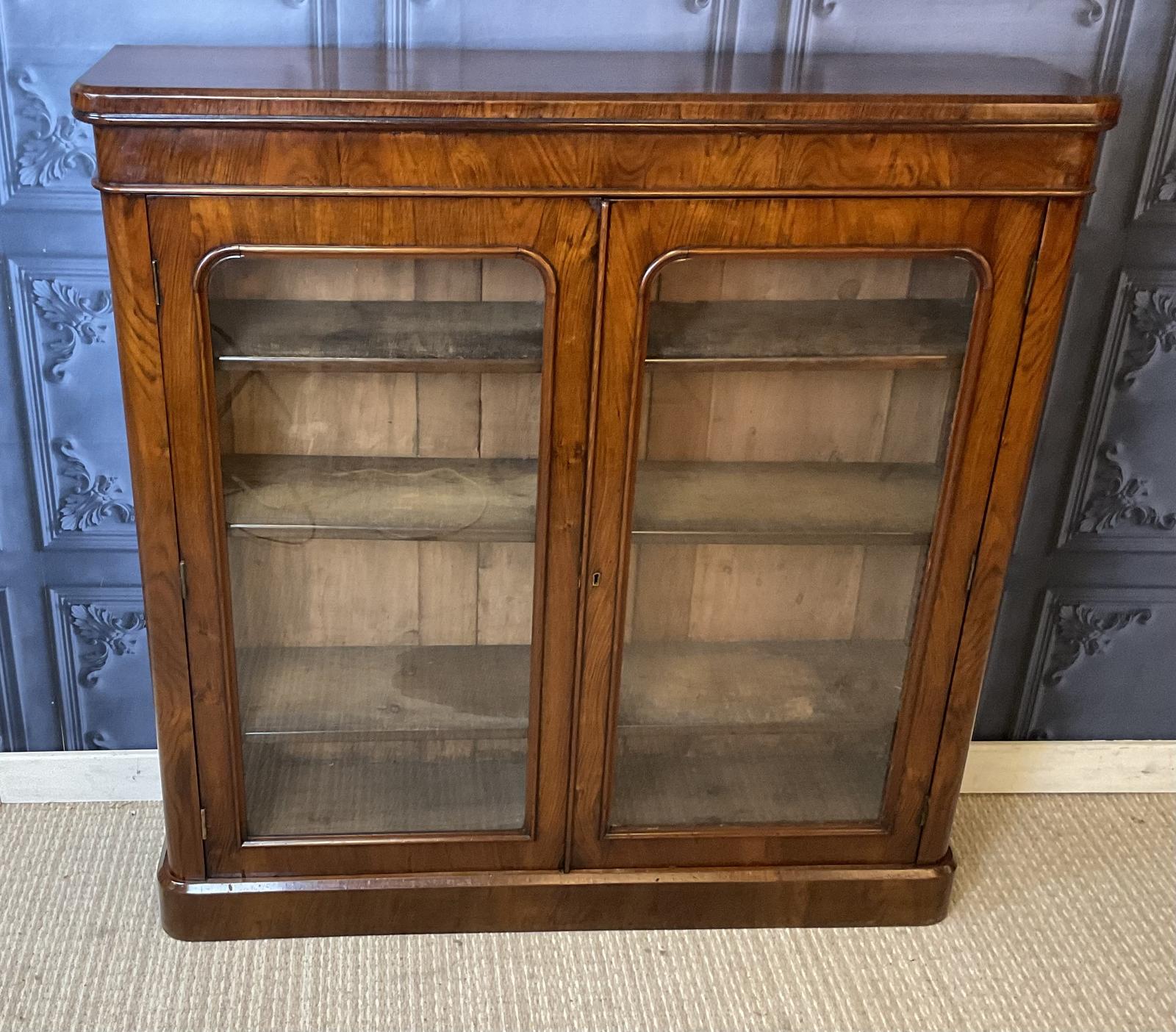 Quality Victorian antique rosewood veneered two door bookcase, highly figured veneers throughout, the two arched glass doors housing three adjustable shelves and standing on a plinth base.