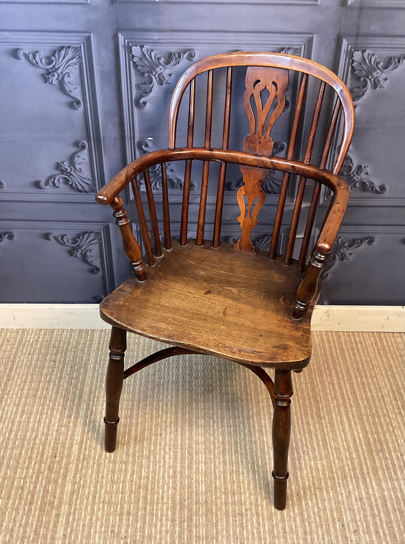Very good Yew Wood and Ash Seat Windsor chair, the whole chair with the exception of the seat is made from Yew Wood good early chair with a good colour throughout, pierced central splat the narrow arms with turned supports to the front and standing on turned legs joined by a crinoline stretcher